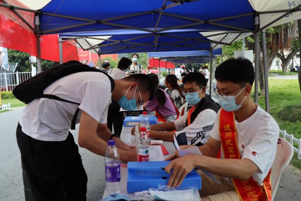 船政南區(qū)校門,同學們佩戴口罩,進行測量體溫,同時對隨身物品進行消毒后方可進入前往報到處。