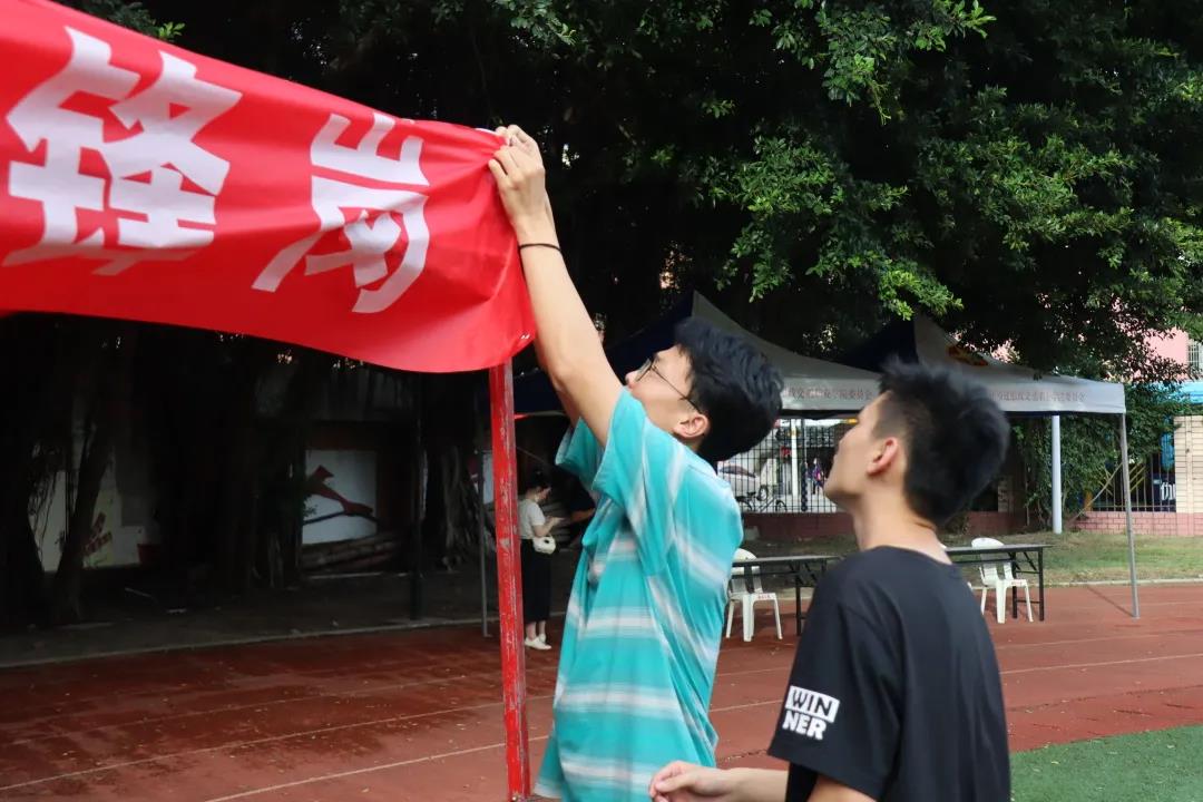 10月14日下午,迎新工作準備的最后一天。學生干部和助教在蒙蒙細雨下搭建著迎新點,為明日迎接新同學做著最后的準備。