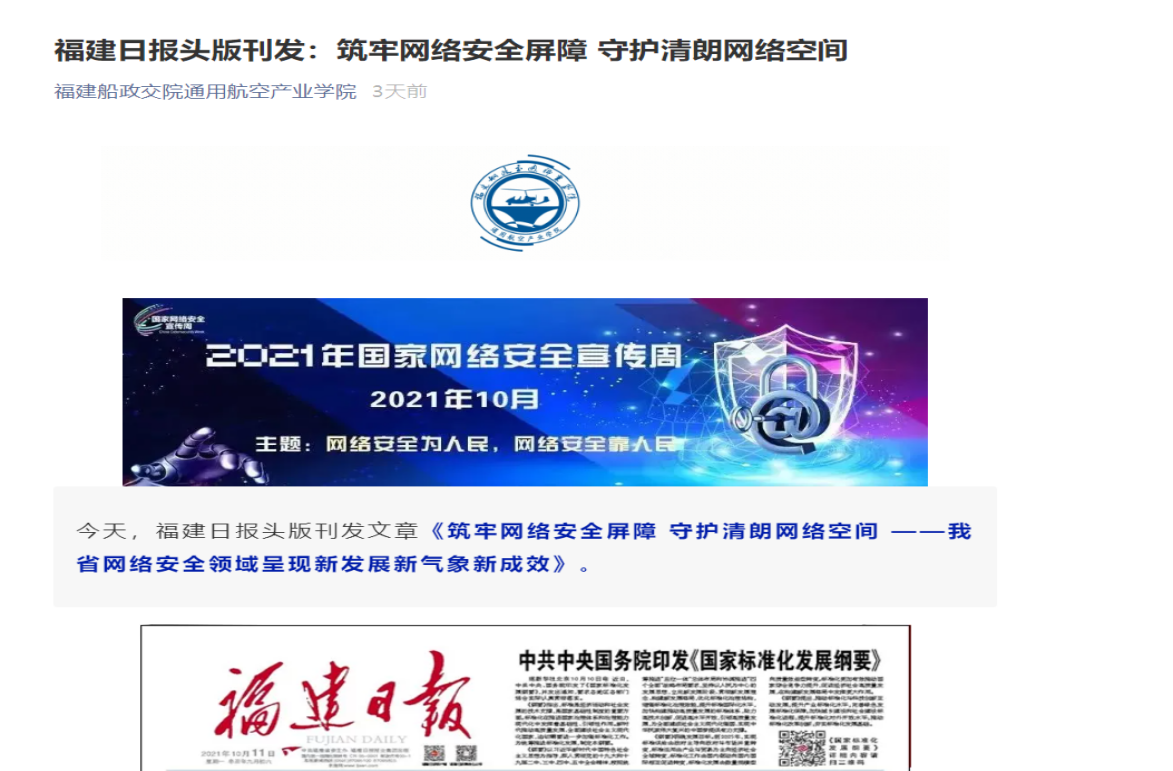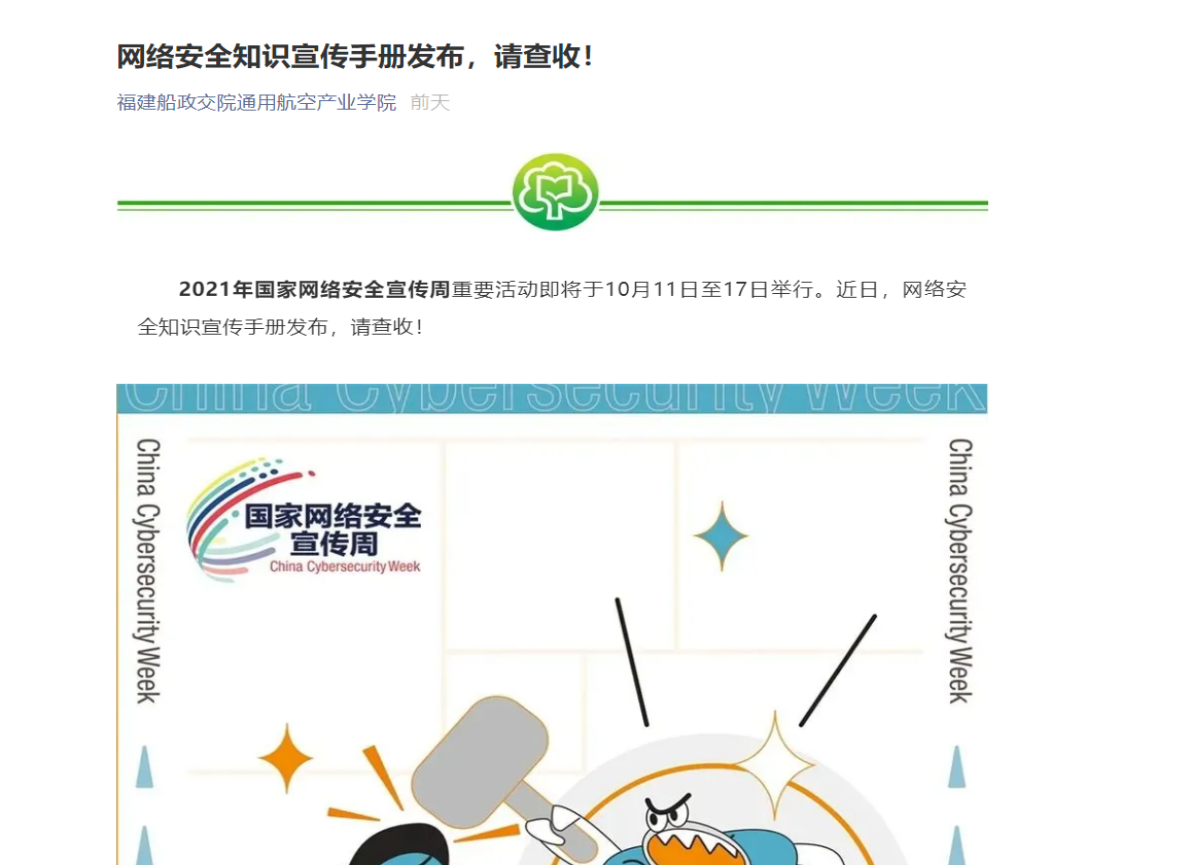 在2021年國家網(wǎng)絡(luò)安全宣傳周期間,通航空產(chǎn)業(yè)學(xué)院開展了一系列線上線下活動(dòng),引導(dǎo)師生養(yǎng)成依法上網(wǎng)、文明上網(wǎng)、安全上網(wǎng)的良好習(xí)慣。二是轉(zhuǎn)載官方網(wǎng)站宣傳網(wǎng)絡(luò)安全小視頻,提醒師生保護(hù)個(gè)人信息,謹(jǐn)防被騙;三是全方位動(dòng)員師生自覺成為維護(hù)國家網(wǎng)絡(luò)安全的重要力量,爭做網(wǎng)絡(luò)安全的踐行者、參與者、推動(dòng)者、宣傳者,為共享共建清朗、便捷的網(wǎng)絡(luò)空間,共同維護(hù)國家網(wǎng)絡(luò)安全營造良好的氛圍。