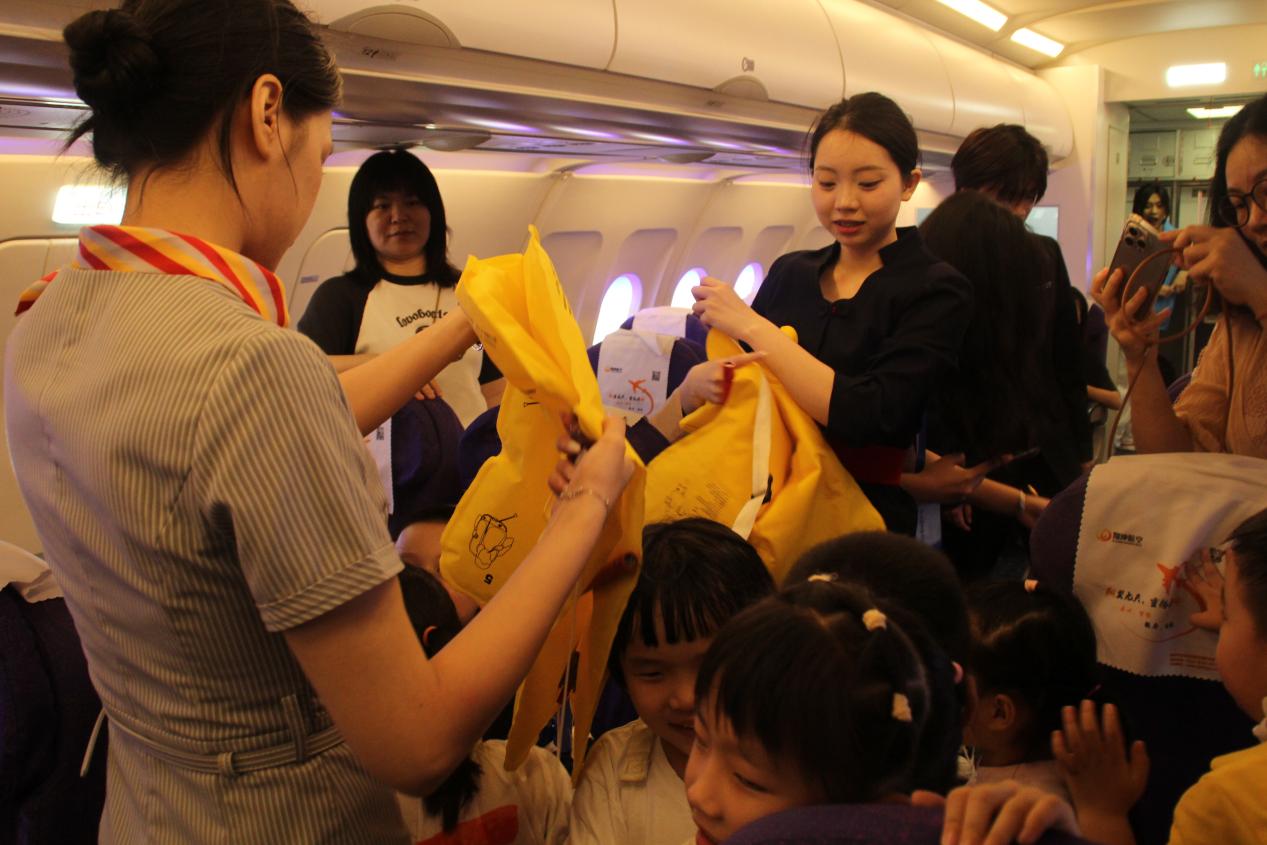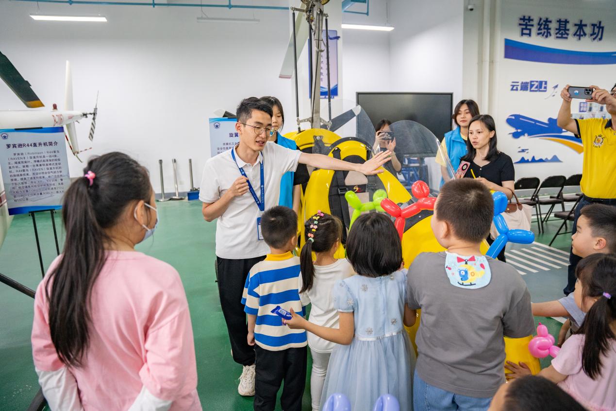 在發(fā)動(dòng)機(jī)實(shí)訓(xùn)室,老師為小學(xué)生們?cè)敿?xì)講解常見航空器的構(gòu)成。在志愿者們的講解下,了解飛機(jī)客艙安全知識(shí)、直升機(jī)的構(gòu)成、以及應(yīng)急工具如何使用等內(nèi)容,并讓小學(xué)生們親身體驗(yàn),更深刻的了解相關(guān)內(nèi)容。