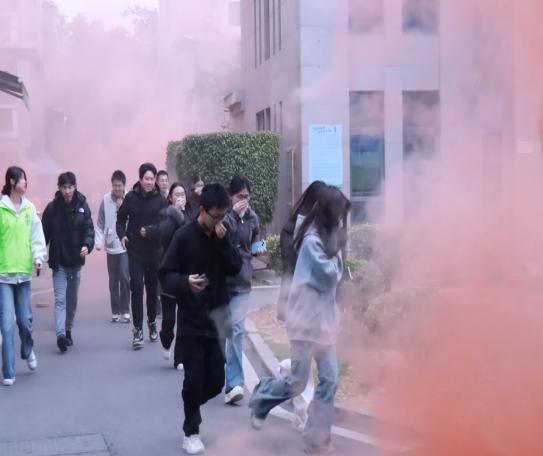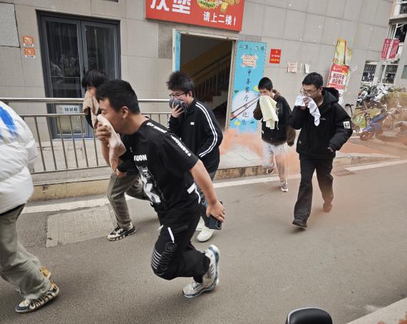 通過(guò)校園內(nèi)警報(bào)聲驟然響起,各宿舍樓的學(xué)生在老師和工作人員的引導(dǎo)下,迅速用濕毛巾捂住口鼻,低姿前行,沿著預(yù)定的疏散路線有序撤離。整個(gè)過(guò)程緊張有序,全體參演學(xué)生就安全疏散至學(xué)校操場(chǎng)的指定區(qū)域。