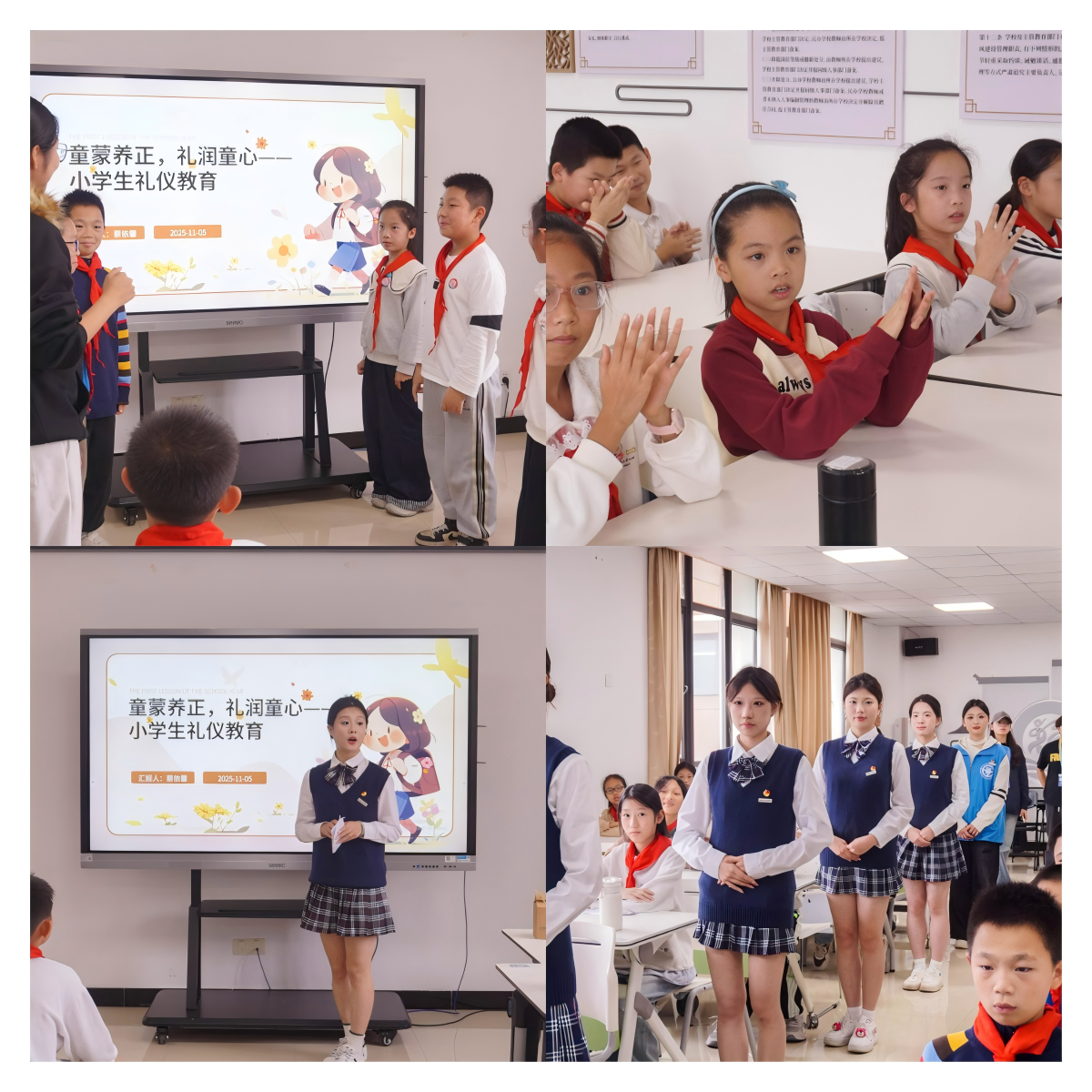 活動伊始,志愿者們身著統(tǒng)一志愿服裝,以挺拔標(biāo)準(zhǔn)的站姿整齊列隊,用嚴(yán)謹(jǐn)端莊的儀態(tài)向現(xiàn)場師生直觀展現(xiàn)禮儀素養(yǎng)的魅力。志愿者們借助精心打磨的PPT課件,將禮儀素養(yǎng)的核心內(nèi)涵與校園問候、課堂坐姿、交往溝通等日常場景緊密結(jié)合,通過趣味動畫短片、經(jīng)典禮儀小故事等孩子們喜聞樂見的形式,深入淺出地解析禮儀的重要意義,讓抽象的禮儀知識變得鮮活可感。