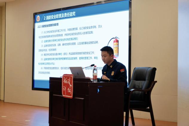 丁偉濱還結(jié)合自身在消防救援領(lǐng)域的實踐經(jīng)歷,圍繞“校園消防安全形勢分析”“消防安全職責(zé)及責(zé)任追究”“常見隱患問題及整治措施”“初期火災(zāi)撲救和應(yīng)急能力建設(shè)”四大模塊,通過真實案例、數(shù)據(jù)統(tǒng)計與視頻警示,深入淺出地講解了火災(zāi)預(yù)防、責(zé)任落實、隱患整治及應(yīng)急自救等關(guān)鍵知識,強調(diào)了“預(yù)防為主、防消結(jié)合”的消防安全理念。
