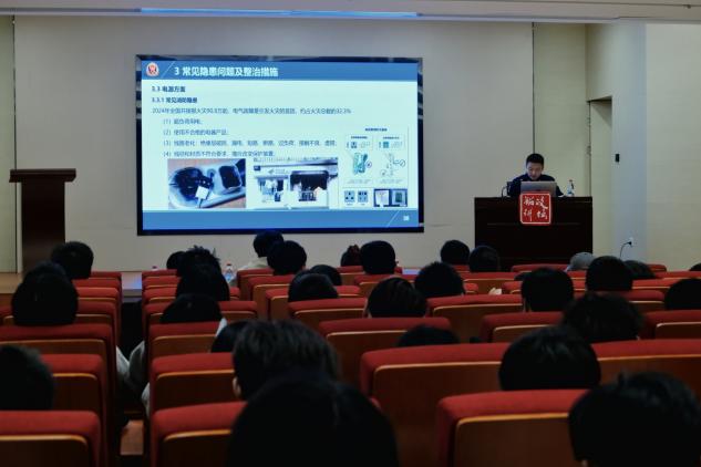 講座伊始,丁偉濱首先從燃燒的基本原理、火災(zāi)發(fā)生的常見原因等基礎(chǔ)知識入手,結(jié)合高校人員密集、實驗室及宿舍隱患多的特點,說明了日常預(yù)防、隱患識別與初期應(yīng)對的關(guān)鍵性。