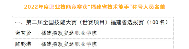 2022年,福建省人社廳授予謝育賢等157名在2022年省級職業(yè)技能競賽中取得優(yōu)異成績的參賽選手“福建省技術(shù)能手”稱號。其中,包括我院教師陳懿港、2021級通用航空器維修專業(yè)謝育賢。