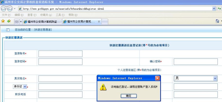 若當(dāng)前電腦登記過了,將直接提示該電腦已登記過,按"確定"接鈕或右上角的X跳轉(zhuǎn)至系統(tǒng)首頁: