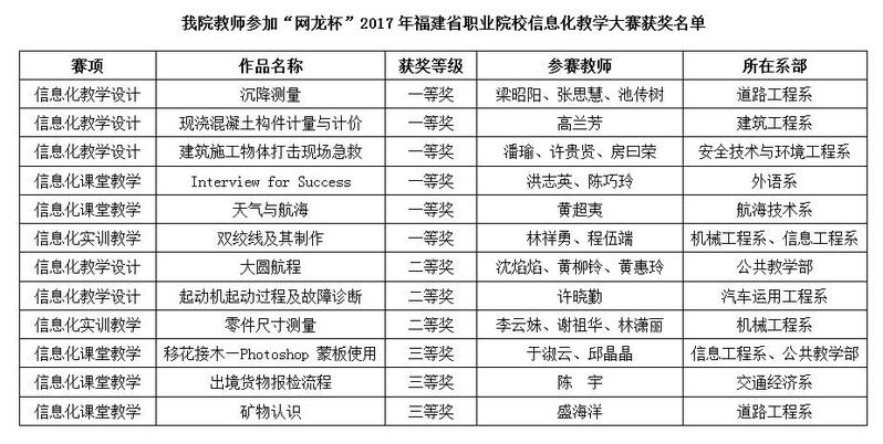 日前,從“網(wǎng)龍杯”2017年福建省職業(yè)院校信息化教學(xué)大賽上傳來喜訊,經(jīng)網(wǎng)絡(luò)初評和現(xiàn)場決賽,我院參賽教師取得一等獎作品6件、二等獎作品3件、三等獎作品3件的優(yōu)異成績,一等獎作品獲獎數(shù)和參賽作品獲獎總成績均位居全省高職院校首位。