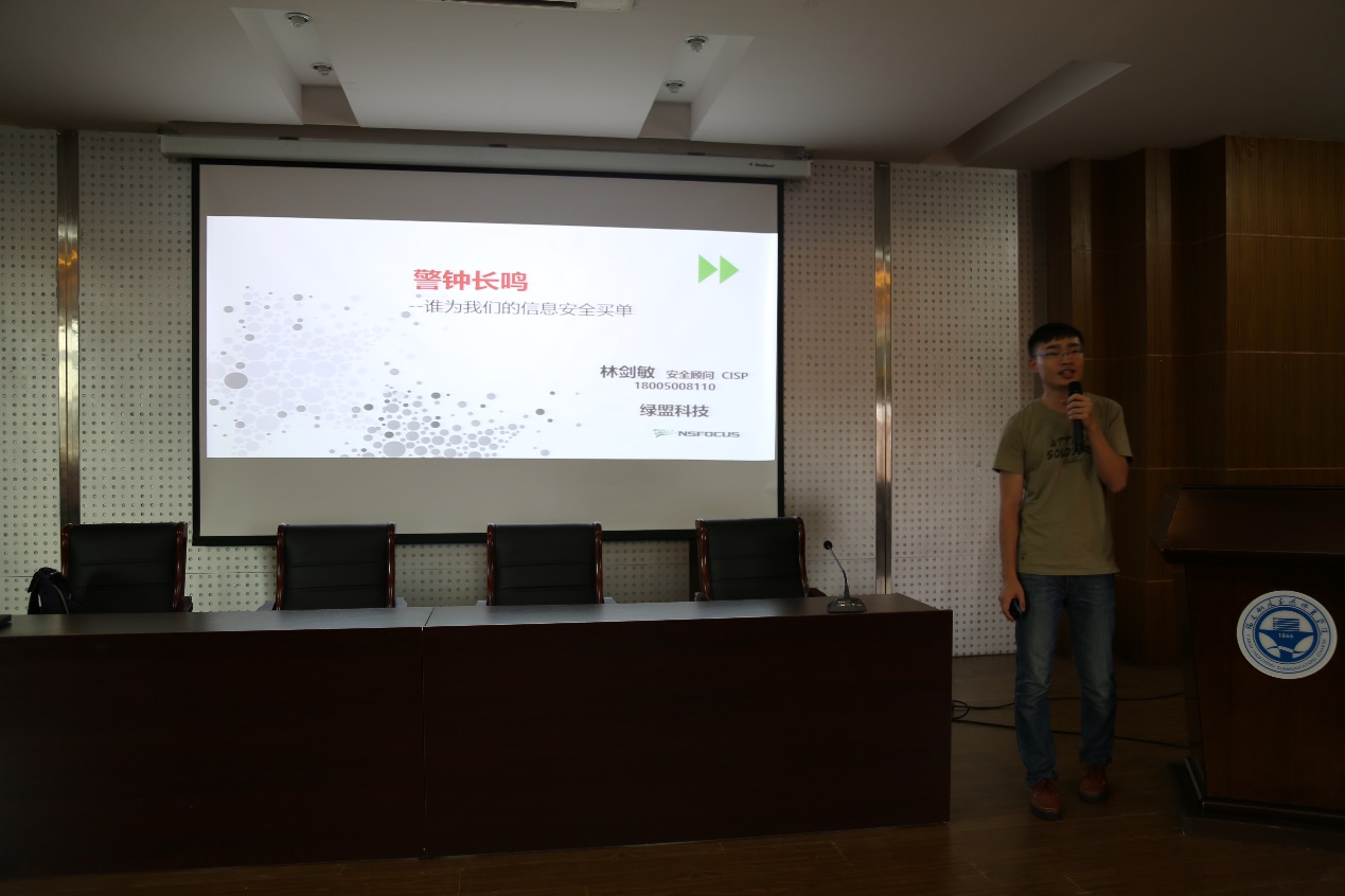 2018625日下午,學(xué)院現(xiàn)代教育技術(shù)及網(wǎng)絡(luò)中心邀請(qǐng)北京神州綠盟科技有限公司安全顧問,中國(guó)信息安全測(cè)評(píng)中心注冊(cè)信息安全專業(yè)人員(CISP)林劍敏對(duì)我院在校生舉辦網(wǎng)絡(luò)安全知識(shí)講座,各系部總計(jì)約350名學(xué)生到場(chǎng)聽取講座。