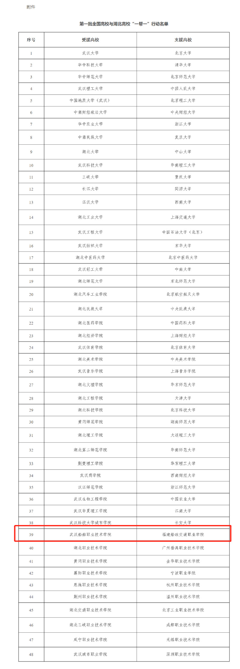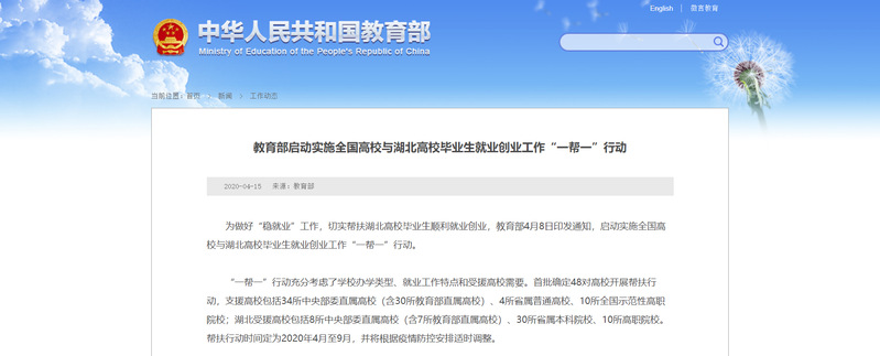 據(jù)悉,“一幫一”行動(dòng)充分考慮了學(xué)校辦學(xué)類型、就業(yè)工作特點(diǎn)和受援高校需要。首批確定48對(duì)高校開(kāi)展幫扶行動(dòng),支援高校包括34所中央部委直屬高校(含30所教育部直屬高校)、4所省屬普通高校、10所全國(guó)示范性高職院校;湖北受援高校包括8所中央部委直屬高校(含7所教育部直屬高校)、30所省屬本科院校、10所高職院校。幫扶行動(dòng)時(shí)間定為2020年4月至9月,并將根據(jù)疫情防控安排適時(shí)調(diào)整。