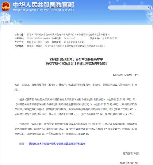 12月18日,教育部、財政部發(fā)布了《關于公布中國特色高水平高職學校和專業(yè)建設計劃建設單位名單的通知》。我院成功入選!成為福建唯一一所入選中國特色高水平高職學校建設單位的高職院校。