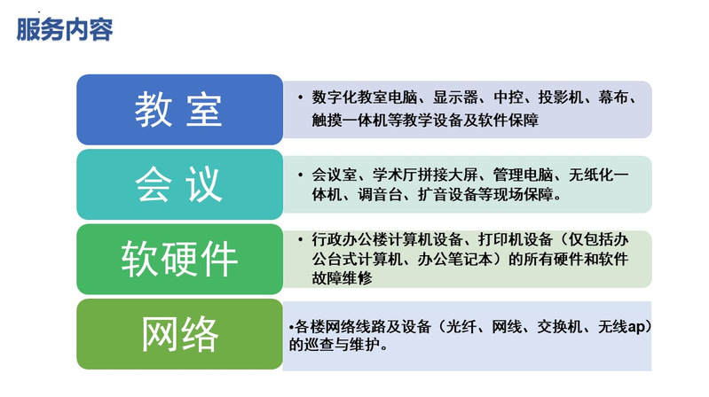 組建服務團隊有效教室信息化設備維保維修響應效率,提高了會議室、報告廳等設備使用保障能力,更好地滿足教育教學需要。