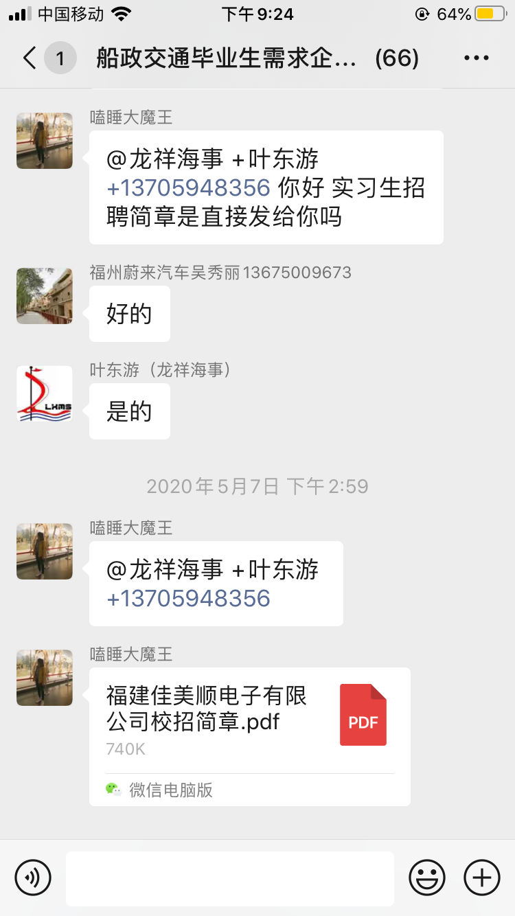 為減輕疫情對(duì)畢業(yè)生就業(yè)的影響,同時(shí)加快推進(jìn)企業(yè)復(fù)工復(fù)產(chǎn),確保如期打贏疫情攻堅(jiān)戰(zhàn)。2020年4月28日-6月28日,福建省船政文化交流協(xié)會(huì)攜手母校福建船政交通職業(yè)學(xué)院共同舉辦“抗疫情 助復(fù)工 穩(wěn)就業(yè)”線上招聘會(huì),企業(yè)在線發(fā)布用工需求,畢業(yè)生線上求職。線上招聘活動(dòng)由協(xié)會(huì)外聯(lián)組組長(zhǎng)葉東游副會(huì)長(zhǎng)負(fù)責(zé)整個(gè)活動(dòng)的具體工作,通過(guò)建立微信群的形式,將收集到的企業(yè)招聘信息,第一時(shí)間轉(zhuǎn)發(fā)到畢業(yè)生就業(yè)指導(dǎo)群,畢業(yè)生根據(jù)自己的專業(yè)和求職意向聯(lián)系企業(yè)面試。