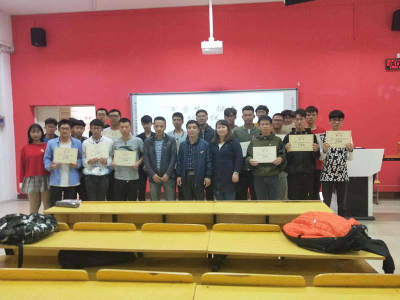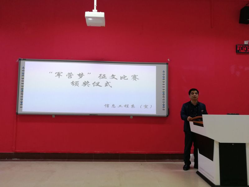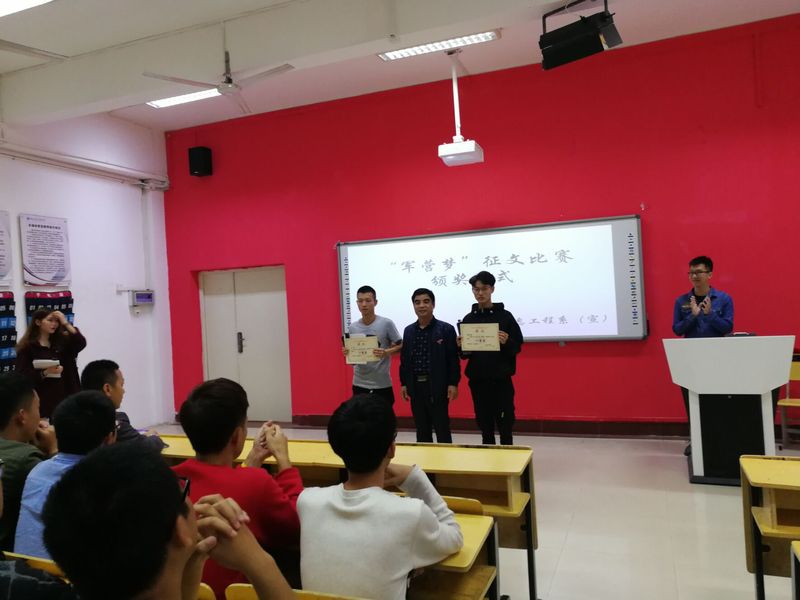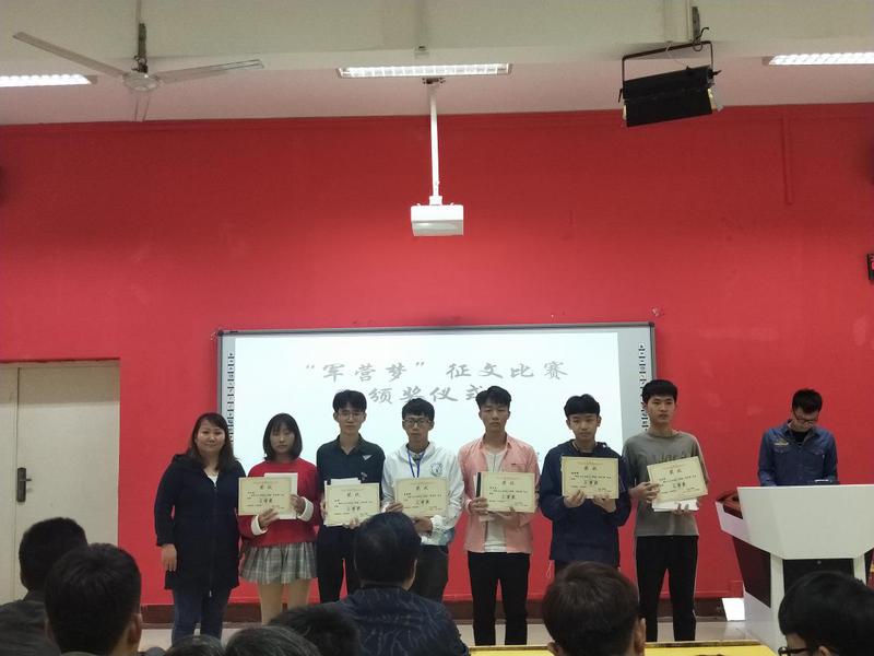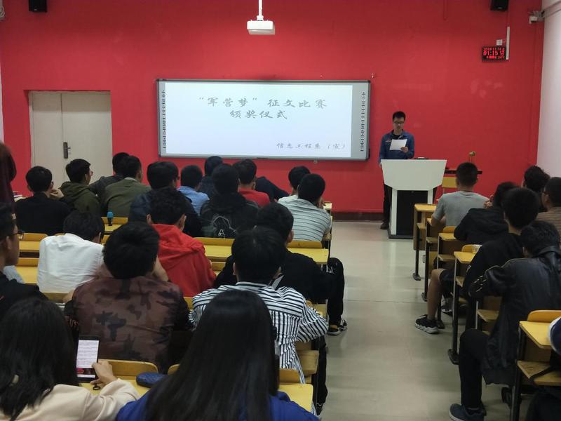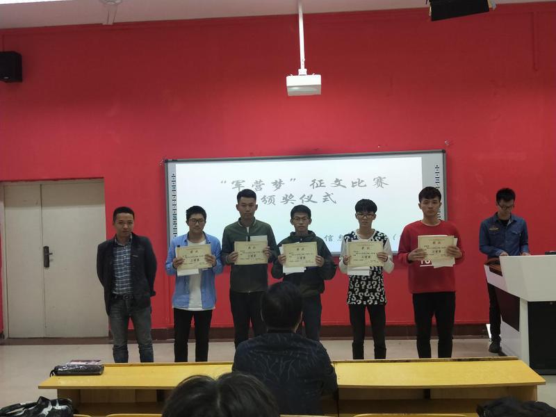為弘揚(yáng)愛國主義精神,營造愛國熱情的學(xué)院風(fēng)范。2018年11月14日下午13:00在船政北區(qū)2#1-5舉行了“軍營夢”征文比賽頒獎儀式。信息系系書記孫基老師、征兵負(fù)責(zé)人唐曉軍老師以及“軍營夢”征文比賽負(fù)責(zé)人2017級輔導(dǎo)員黃華梅老師。本次頒獎儀式由2017級電信班唐宋杰主持。