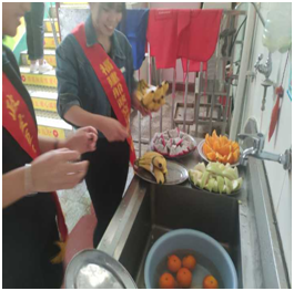 志愿者整理衛(wèi)生和切洗水果