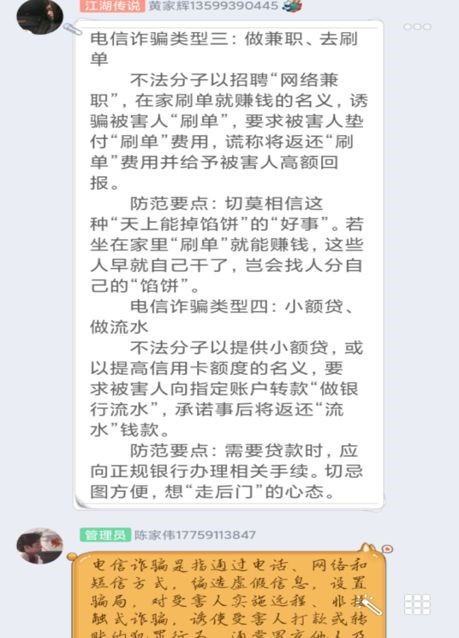 薛凌志,19計(jì)算機(jī)網(wǎng)絡(luò)技術(shù)1班學(xué)生,入讀大學(xué)之前做過輔警,接觸過網(wǎng)絡(luò)詐騙的案件,參加過網(wǎng)絡(luò)詐騙培訓(xùn),對(duì)網(wǎng)絡(luò)詐騙有一定了解。為此,信息系決定開展一次線上防詐騙主題宣傳,由薛凌志擔(dān)任宣講人。全部以學(xué)生為主的線上防詐騙宣傳是一個(gè)全新嘗試,在輔導(dǎo)員和班主任的指導(dǎo)下,由薛凌志同學(xué)制定宣講計(jì)劃,構(gòu)建15種詐騙類型框架,同時(shí)輔以案例強(qiáng)化理解。為期三個(gè)晚上的宣講既注重重點(diǎn)講解,又注重過程互動(dòng),學(xué)生反響強(qiáng)烈。根據(jù)反饋,各班級(jí)QQ群上線率、參與率平均達(dá)90%,宣傳效果良好。