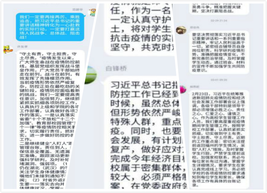 通過本次的線上主題黨日活動,支部全體黨員進一步深入貫徹習近平總書記關(guān)于疫情防控工作的重要講話精神。大家一致表示,要繼續(xù)發(fā)揮支部堡壘和黨員先鋒模范作用,積極投身到抗擊疫情斗爭中,努力沖在前、作表率,按照學院戰(zhàn)疫部署,堅持線上線下同頻共振,堅決打贏新冠肺炎疫情阻擊戰(zhàn)。