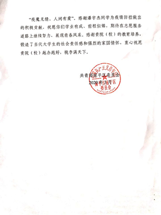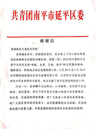 近期,信息工程系收到一封來自共青團(tuán)南平市延平區(qū)委的感謝信,來信主要是為了感謝我系19級軟件技術(shù)專業(yè)學(xué)生潘宇杰同學(xué)。疫情期間,潘宇杰同學(xué)積極報名參加社區(qū)防疫工作,有力支援了南平市延平區(qū)的疫情防控工作。信中共青團(tuán)延平區(qū)委高度表揚(yáng)了潘宇杰同學(xué)志愿參與疫情防控的無私奉獻(xiàn)精神,同時也表達(dá)了祝我院越辦越好,桃李滿天下的美好祝愿。