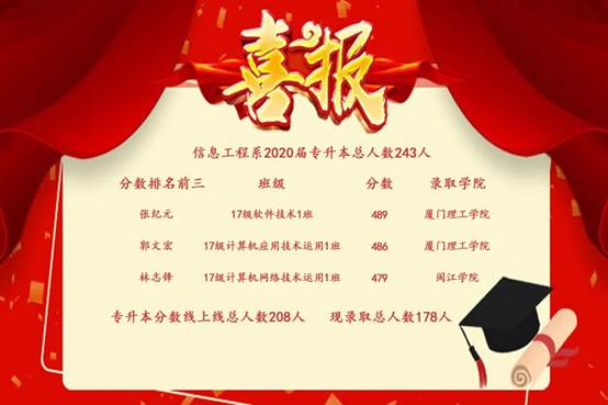 其中17級軟件技術(shù)1班張紀(jì)元同學(xué),專升本分?jǐn)?shù)489分被廈門理工學(xué)院錄取;17級計(jì)算機(jī)技術(shù)運(yùn)用1班郭文宏同學(xué),專升本分?jǐn)?shù)486分被廈門理工學(xué)院錄取;17級計(jì)算機(jī)網(wǎng)絡(luò)技術(shù)運(yùn)用1班林志鋒同學(xué),專升本分?jǐn)?shù)479分被閩江學(xué)院錄取。捷報(bào)傳來,我院師生歡欣鼓舞!