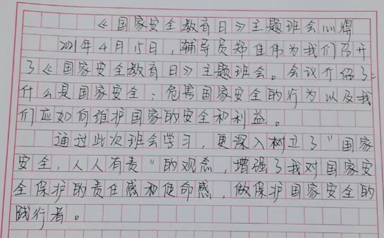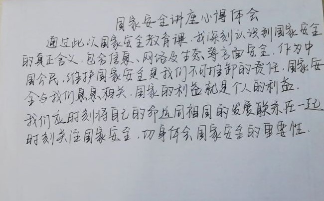 在此次國(guó)家安全教育活動(dòng)中,同學(xué)們也認(rèn)識(shí)和了解了一些危害黨和國(guó)家安全的違法行為。同學(xué)們紛紛發(fā)表心得,表示要堅(jiān)決反對(duì)任何一切破壞國(guó)家安全的行為。