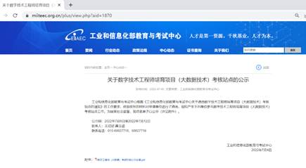 20227月,工業(yè)和信息化部教育與考試中心在官司網(wǎng)進(jìn)行了遴選結(jié)果的公示,https://www.miiteec.org.cn/plus/view.php?aid=1870。我校成為首批數(shù)字技術(shù)工程師培育項(xiàng)目(大數(shù)據(jù)技術(shù))考核站點(diǎn)之一。