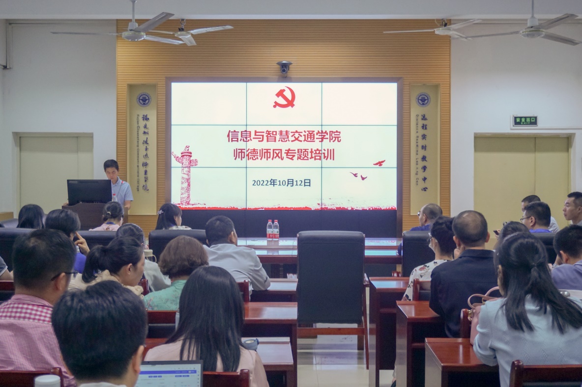 十年樹木百年樹人,教育為重,德育為先,這是師德建設重要性的深刻體現。教師是立校之本,師德是教育之魂。為進一步推進我院師德師風建設工作,打造作風過硬、師德高尚的教師隊伍,樹立嚴格自律、愛崗敬業(yè)、為人師表的良好教師形象。10月12日,信息與智慧交通學院組織學院全體教職工于福道園自強樓2-1開展師德師風專題培訓。此次培訓由信息與智慧交通學院黨總支書記許友孝主持。