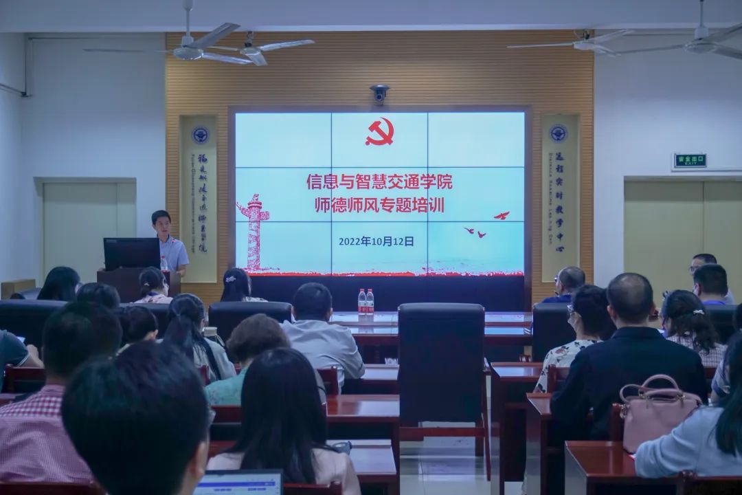 師德是教師最重要的素質(zhì),是教育之靈魂。為進(jìn)一步推進(jìn)我院師德師風(fēng)建設(shè)工作,打造作風(fēng)過(guò)硬、師德高尚的教師隊(duì)伍,樹(shù)立嚴(yán)格自律、愛(ài)崗敬業(yè)、為人師表的良好教師形象,10月12日,信息與智慧交通學(xué)院組織學(xué)院全體教職工于福道園自強(qiáng)樓2-1開(kāi)展師德師風(fēng)專(zhuān)題培訓(xùn)。本次培訓(xùn)由信息與智慧交通學(xué)院黨總支書(shū)記許友孝主持。
