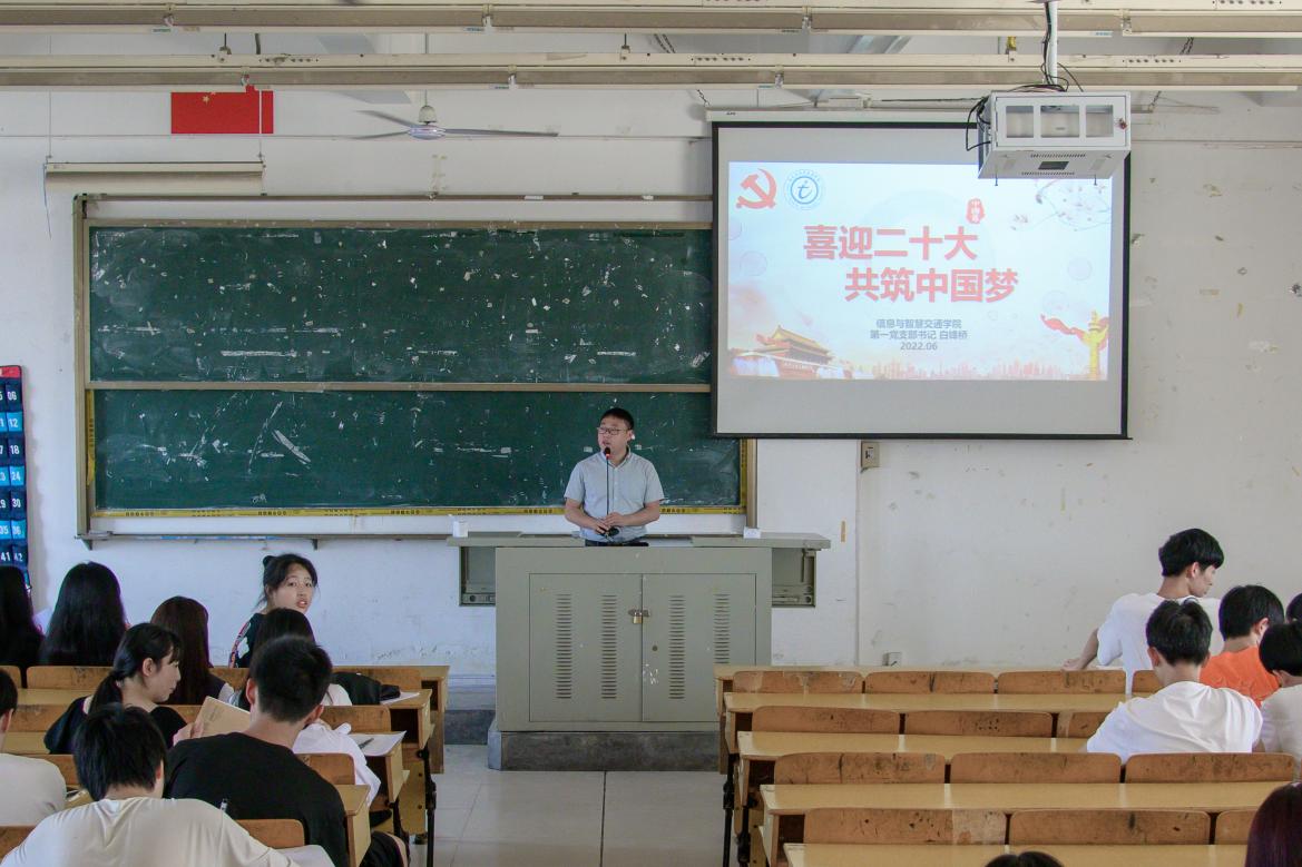 信息與智慧交通學院第一黨支部書記白鋒橋以《喜迎二十大 共筑中國夢》為主題,圍繞“開展背景及時間相關(guān)概念綜述”、“政治工作的總體要求”、“政治工作的學習教育內(nèi)容”、“政治工作的主要措施”、“政治工作的組織領(lǐng)導”五個方面展開。