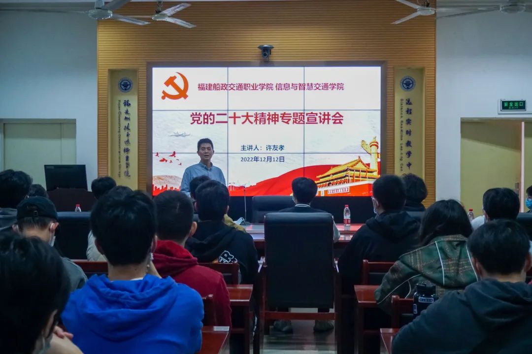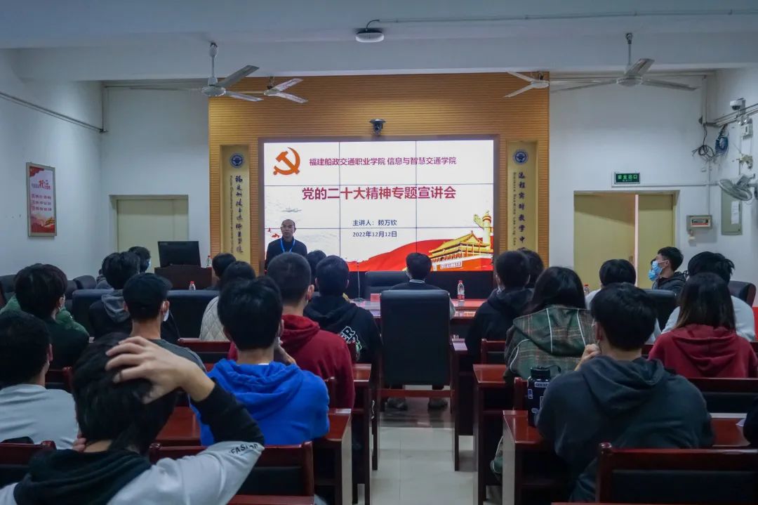 為進一步深入學(xué)習(xí)貫徹黨的二十大精神,持續(xù)掀起全院師生學(xué)習(xí)貫徹黨的二十大精神的熱潮,推動黨的二十大精神入腦入心、走深走實,信息與智慧交通學(xué)院于12月12日在福道園自強樓2-1教室召開學(xué)習(xí)黨的二十大精神專題宣講會。專題宣講會分別由學(xué)院黨總支書記許友孝、院長賴萬欽主講,全體輔導(dǎo)員和21、22級各班長、團支書、入黨積極分子參加了本次宣講會。