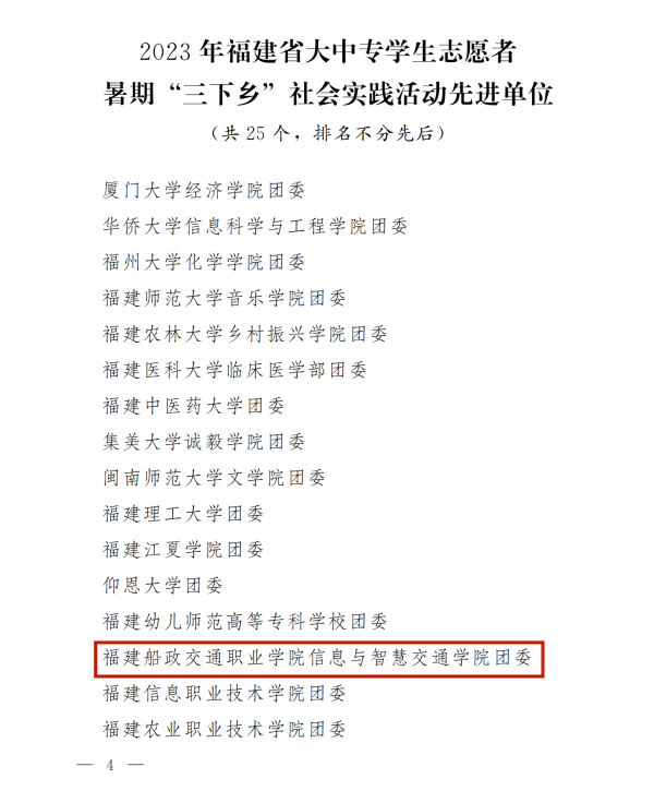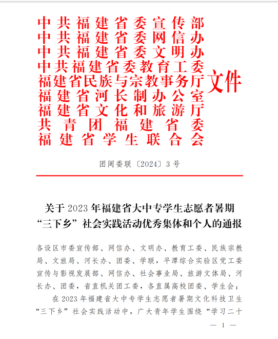 近日,在2023年福建省大中專學(xué)生志愿者暑期文化科技衛(wèi)生“三下鄉(xiāng)”社會(huì)實(shí)踐活動(dòng)總結(jié)表彰中,我院榮獲2023年福建省大中專學(xué)生志愿者暑期“三下鄉(xiāng)”社會(huì)實(shí)踐活動(dòng)先進(jìn)單位。