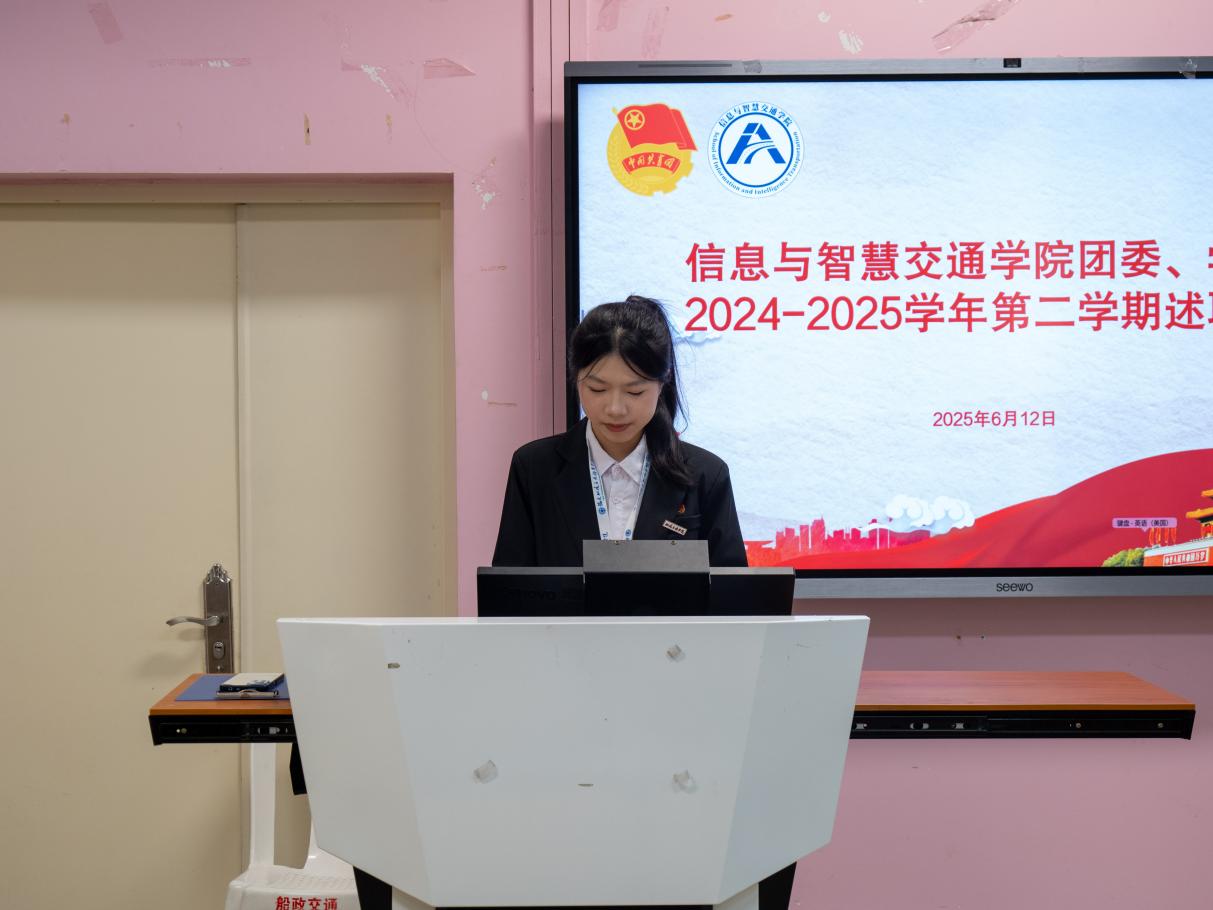 為總結(jié)2024-2025學(xué)年第二學(xué)期工作成效,凝聚團(tuán)學(xué)組織發(fā)展動(dòng)能,推動(dòng)學(xué)生工作在新時(shí)代教育實(shí)踐中提質(zhì)增效,2025612日,信息與智慧交通學(xué)院2024-2025-2學(xué)期兩委干部述職大會(huì)在福道園自強(qiáng)樓2-3室舉行。學(xué)院分團(tuán)委副書(shū)記沈晨晞、學(xué)院團(tuán)組織學(xué)生干部、學(xué)院學(xué)生會(huì)工作人員及學(xué)生代表參加會(huì)議。會(huì)議由學(xué)院分團(tuán)委兼職副書(shū)記(學(xué)生)朱翠琪主持。
