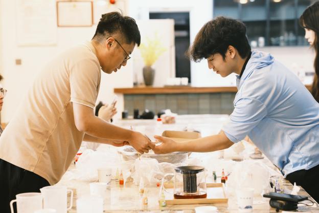 短暫互動后,踐行團成員協(xié)助臺灣大學生完成非遺漆扇制作?;顒又?,掌握漆藝技巧的踐行團成員從扇面構(gòu)圖到漆料運用,手把手指導臺灣同伴完成調(diào)色、繪制等工序。雙方在創(chuàng)作過程中交流兩岸漆藝發(fā)展情況,互鑒創(chuàng)作靈感,原本素白的扇面逐漸呈現(xiàn)出獨具特色的紋樣。這些由兩岸青年共同完成的漆扇作品,既承載著傳統(tǒng)工藝的匠心,又融入了青春友情的溫度。此次活動通過非遺手作這一生動形式,讓兩岸青年在協(xié)作中深化文化認同,為基層社會服務增添了動人的文化色彩。