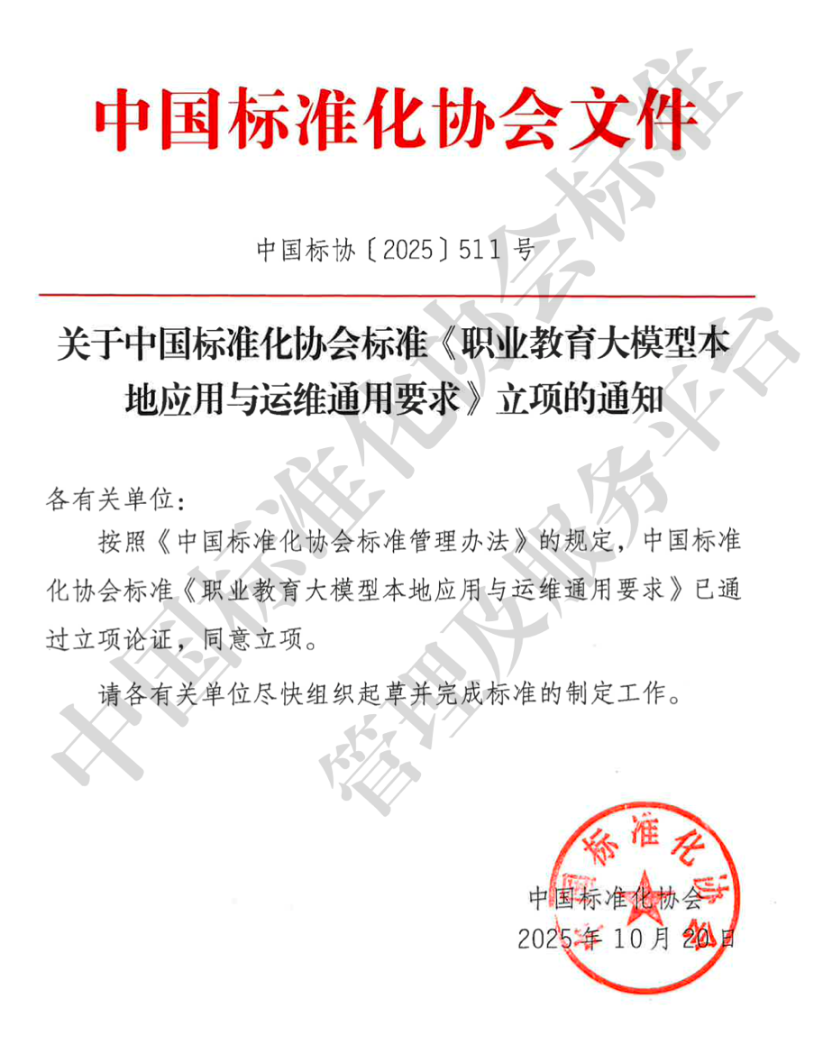 近日,由我院參與編制的團體標(biāo)準(zhǔn)《職業(yè)教育大模型本地應(yīng)用與運維通用要求》已正式通過中國標(biāo)準(zhǔn)化協(xié)會立項,標(biāo)志著我院在人工智能與職業(yè)教育深度融合方向的標(biāo)準(zhǔn)化工作取得重要階段性成果。