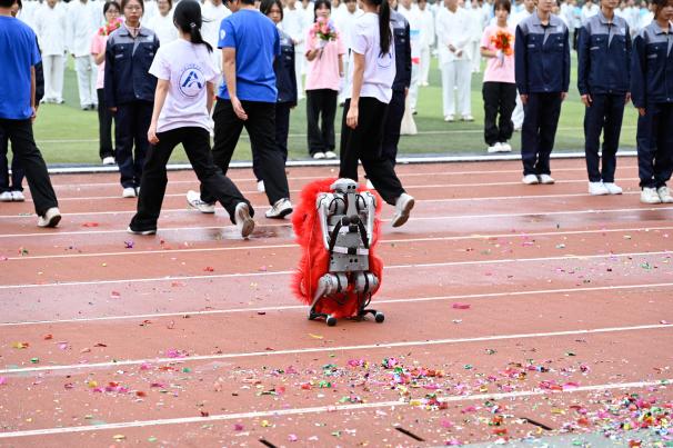 開(kāi)幕式上,我院學(xué)子組成的方陣踏著整齊步伐有序入場(chǎng)。同學(xué)們身著統(tǒng)一服裝,嘹亮口號(hào)響徹賽場(chǎng),將朝氣蓬勃的精神面貌展現(xiàn)得淋漓盡致。方陣退場(chǎng)后,扇子舞表演緩緩啟幕:數(shù)十名學(xué)子手持彩扇,隨音樂(lè)節(jié)拍翩然起舞,動(dòng)作規(guī)范劃一,扇面開(kāi)合間盡顯韻律之美,贏得臺(tái)下陣陣掌聲。隨后,科技元素驚艷登場(chǎng),身著同款服裝的機(jī)器人邁著穩(wěn)健步伐步入場(chǎng)地,精準(zhǔn)流暢的動(dòng)作宛如一場(chǎng)“科技舞蹈”;機(jī)器狗亦活力十足,在場(chǎng)地內(nèi)靈動(dòng)穿梭,更騰空躍起完成利落空翻。二者的精彩演繹,引得現(xiàn)場(chǎng)歡呼聲此起彼伏。整場(chǎng)表演既彰顯學(xué)子風(fēng)采,又展現(xiàn)科技成果,成功將開(kāi)幕式氛圍推向高潮。