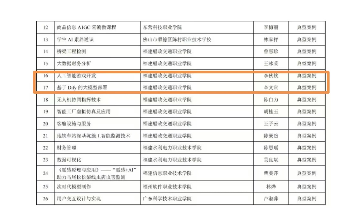 近日,教育部職業(yè)院校信息化教學(xué)指導(dǎo)委員會(huì)公示了人工智能應(yīng)用典型案例遴選結(jié)果,我院李伙欽老師申報(bào)的《人工智能游戲開(kāi)發(fā)》和辛文宣老師申報(bào)的《基于Dify的大模型部署》入選“人工智能微課程典型案例”,曾凌靜老師申報(bào)的《人工智能應(yīng)用》入選“人工智能通識(shí)課程典型案例”。