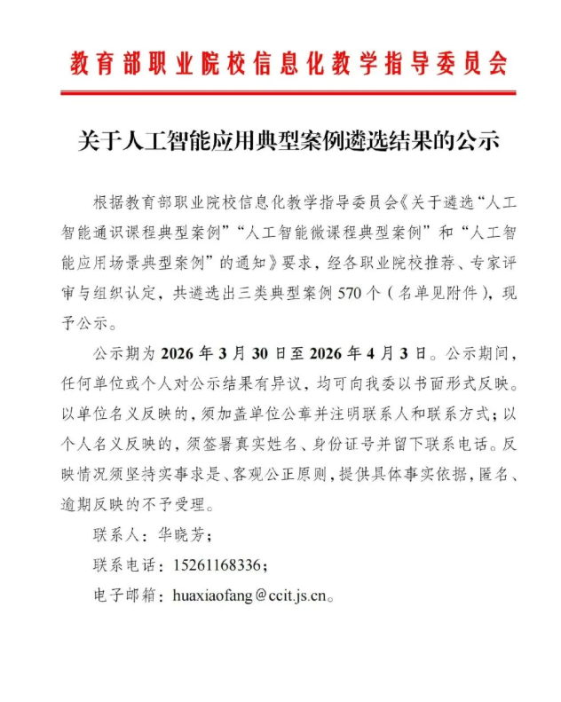 本次遴選經(jīng)全國(guó)各職業(yè)院校推薦、專家評(píng)審與組織認(rèn)定,共選出三類典型案例570個(gè)。我院三個(gè)案例項(xiàng)目的成功入選,充分體現(xiàn)了我院在人工智能教學(xué)領(lǐng)域的扎實(shí)積累與創(chuàng)新探索,展現(xiàn)了教師團(tuán)隊(duì)在課程建設(shè)與教學(xué)改革中的積極成效。