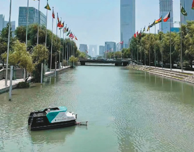 通過(guò)遠(yuǎn)程操控設(shè)置好作業(yè)任務(wù),無(wú)人清潔船便沿著預(yù)定線(xiàn)路作業(yè),不一會(huì)兒就滿(mǎn)載水草和漂浮物順利返航,環(huán)衛(wèi)工人無(wú)需下水,只需在岸邊傾倒垃圾筐即可。電量低了,無(wú)人船也會(huì)自主返航、充電,再投入作業(yè)。