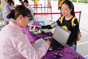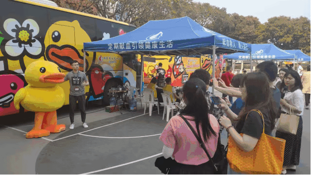 同學(xué)們被小黃鴨獻(xiàn)血車萌萌的外表吸引,紛紛填表登記,上車捋袖獻(xiàn)血。