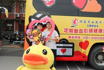 ▲裝飾著福州市花“茉莉花”的小黃鴨主題獻(xiàn)血車停于校文體中心旁