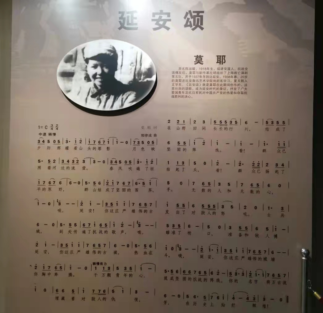 “夕陽(yáng)輝耀著山頭的塔影,月色映照著河邊的流螢。春風(fēng)吹遍了坦平的原野,群山結(jié)成了堅(jiān)固的圍屏。哦,延安!你這莊嚴(yán)雄偉的古城,到處傳遍了抗戰(zhàn)的歌聲……”團(tuán)員青年們來(lái)到《延安頌》展廳前,一起聆聽(tīng)由福建安溪籍老革命女作家莫耶創(chuàng)作的獻(xiàn)給革命圣地的心靈之歌《延安頌》,大家都沉醉在壯麗的歌聲中,感受到當(dāng)時(shí)廣大愛(ài)國(guó)青年及抗日軍民對(duì)中國(guó)共產(chǎn)黨的熱愛(ài)和奪取抗日勝利的決心。