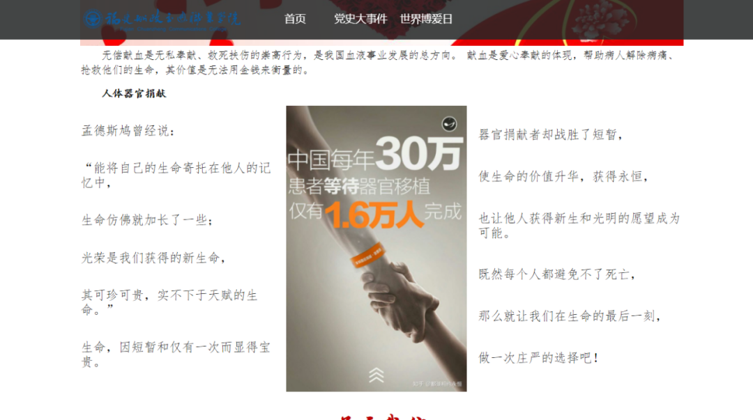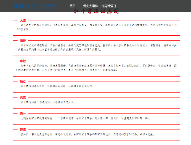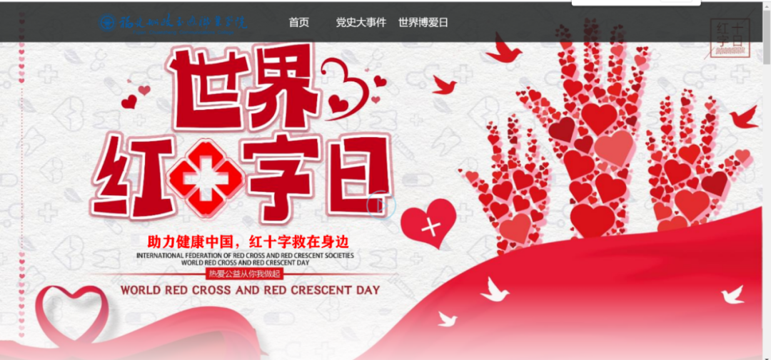 通過對黨史的學習,我們更好的了解過去,以革命先輩的崇高精神為追求,我校紅十字會學生分會于5月1日-10日開展“學史崇德,博愛載物”網(wǎng)頁設計比賽,本次活動共收到船政學子投稿作品40份。有力推動學習黨史氛圍,在踐行社會主義核心價值觀中,弘揚“人道、博愛、奉獻”的紅十字精神。