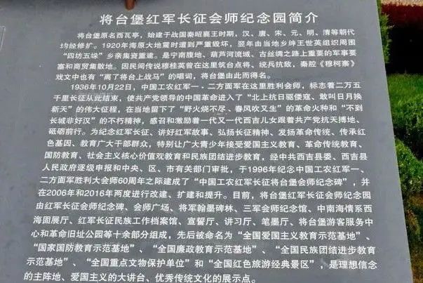 2016年紅軍長(zhǎng)征勝利80周年前夕,習(xí)近平總書記冒雨來到這里,“緬懷先烈,不忘初心,走好新的長(zhǎng)征路”的號(hào)令從這里傳遍中華大地,這里便是將臺(tái)堡。將臺(tái)堡位于寧夏固原市西吉縣南部葫蘆河與馬蓮川河交匯處,民間傳說為古代軍事要塞的點(diǎn)將臺(tái),民國(guó)初年在此筑城堡,由此得名將臺(tái)堡。1936年10月22日,中國(guó)工農(nóng)紅軍一、二方面軍在將臺(tái)堡會(huì)師,標(biāo)志著震驚中外、舉世聞名的紅軍二萬五千里長(zhǎng)征勝利結(jié)束,在中國(guó)革命史上具有重要的歷史意義?,F(xiàn)今,將臺(tái)堡已成為重溫長(zhǎng)征歷史,緬懷革命先烈,發(fā)揚(yáng)長(zhǎng)征精神,接受愛國(guó)主義教育的理想場(chǎng)所。今天,團(tuán)團(tuán)就帶領(lǐng)大家一起走進(jìn)將臺(tái)堡,追憶火紅的長(zhǎng)征記憶,與革命精神做一次跨躍時(shí)空和地域的深情連線。