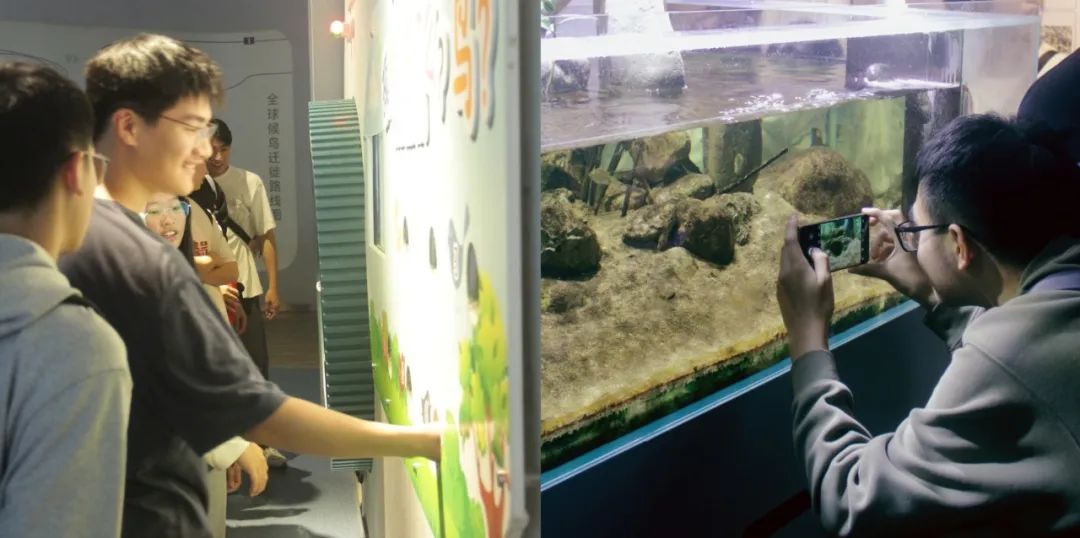 除了科普內(nèi)容外,展廳提供形式多樣的趣味互動,比如能召喚候鳥的房間,判斷候鳥能否吃哪種食物的轉(zhuǎn)盤,動物看世界的體驗(yàn)區(qū)……最有趣當(dāng)數(shù)河流濕地生態(tài)系統(tǒng)、濱海濕地生態(tài)系統(tǒng)。通過真實(shí)再現(xiàn)濕地水域情況,完全展示凈化原理,社員們對于濕地生態(tài)系統(tǒng)概念及構(gòu)成、濕地鳥類種類及生存情況、濕地生態(tài)保護(hù)修復(fù)有了新的認(rèn)識,理解濕地在“碳中和”“碳達(dá)峰”建設(shè)過程中的重要作用。