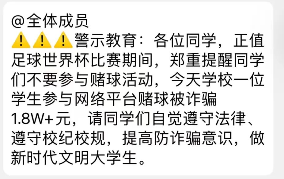 2022年卡塔爾世界杯大幕已經(jīng)拉開,許多球迷的熱情已經(jīng)點(diǎn)燃。在廣大球迷們準(zhǔn)備啤酒和烤串歡樂看球的同時(shí),也給不法分子帶來了一場(chǎng)“蓄謀已久”的“賭球”狂歡,誘惑著人們跳進(jìn)深淵。不法分子借助微信、微博、抖音等網(wǎng)絡(luò)平臺(tái)進(jìn)行隱秘推廣,引誘受害人登錄博彩網(wǎng)站或下載賭球博彩“APP”進(jìn)行充值下注,當(dāng)充值金額達(dá)到一定數(shù)額后無法提現(xiàn)進(jìn)而被騙。此外,此類詐騙案件還具有受騙人員分布廣、財(cái)產(chǎn)損失大等特點(diǎn),因犯罪團(tuán)伙多集中在境外,案件偵辦難度也相對(duì)較大。大家一定要注意防范,避免世界杯變成“世界悲”。