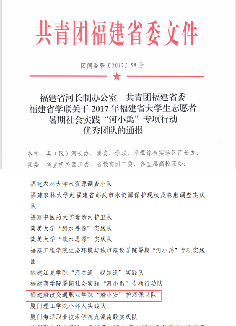 2017年福建省大中專學(xué)生志愿者暑期社會(huì)實(shí)踐“河小禹”專項(xiàng)行動(dòng)優(yōu)秀團(tuán)隊(duì)
