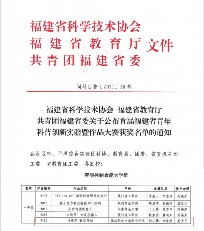 福建省青年科普創(chuàng)新實驗暨作品大賽一等獎