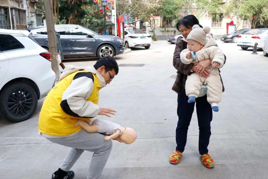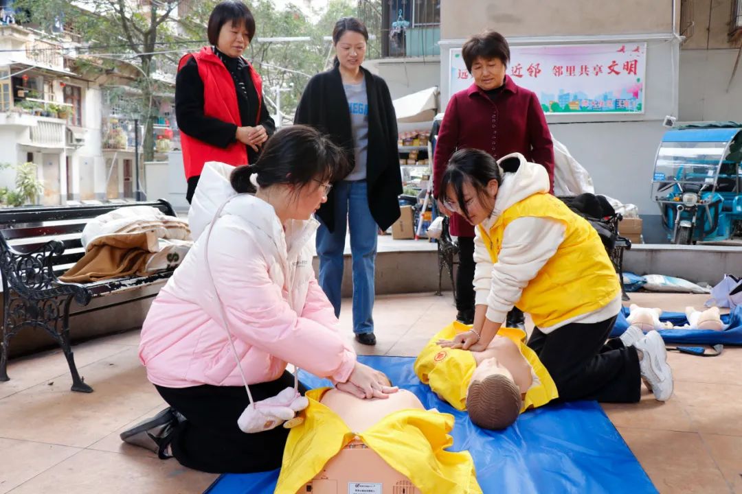 志愿者先向居民講解有關(guān)心肺復蘇救護、海姆立克急救法和包扎的基本常識與應用環(huán)境,隨后居民在志愿者們的協(xié)助下進行實操,如在仿真人體上演練心肺復蘇和海姆立克急救法,真人練習三角巾包扎,讓居民們對于急救知識有了深入的了解。