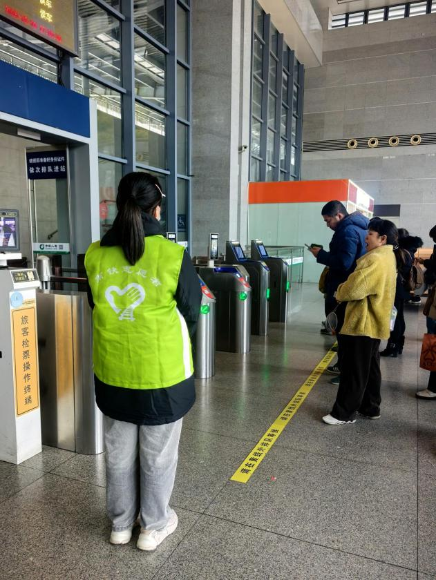 服務過程中,同學們值守游客服務咨詢點與檢票通道,為旅客解答線上購票、班次調度等問題,主動幫扶攜帶大件行李的旅客,為老人、兒童等特殊群體開辟綠色通道。面對旅客在自助檢票機前的困惑,同學們細致演示操作流程;客流高峰時,沉穩(wěn)維持現場秩序,引導人流有序分流,確保通道暢通。
